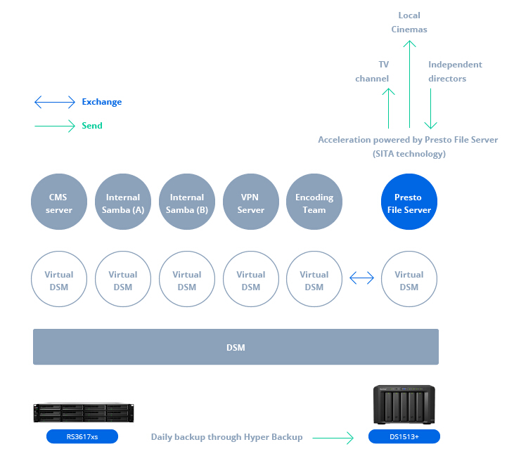 現(xiàn)在,它可以在一臺(tái)服務(wù)器上同時(shí)將內(nèi)容分發(fā)給許多合作伙伴。由于 Synology NAS 上啟用了 Btrfs 文件系統(tǒng),只需要相同文件的一個(gè)實(shí)體副本,因此可以留出更多容量來存儲(chǔ)更多內(nèi)容。