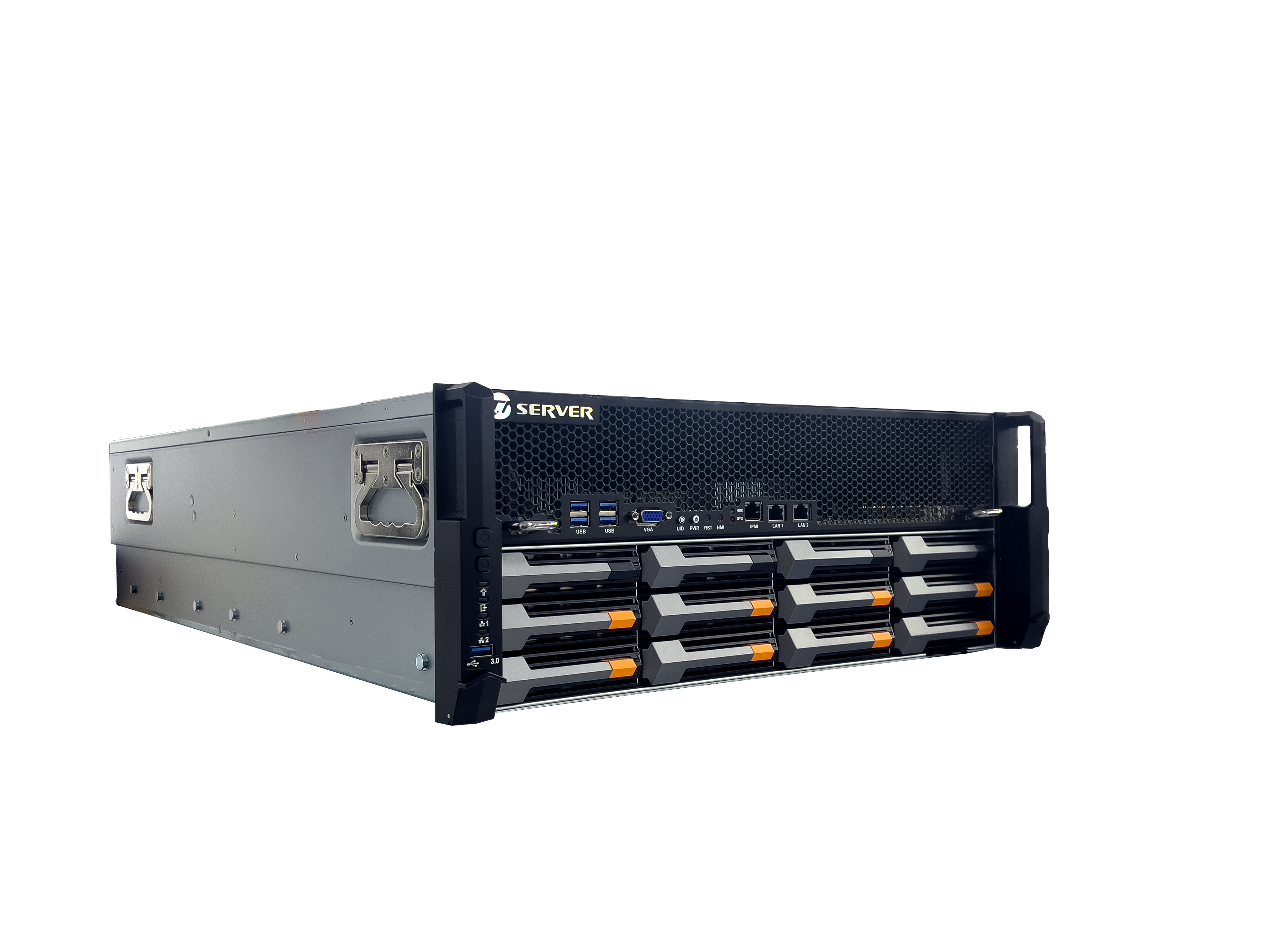 前置:5個USB 3.0,1個VGA接口,1個RJ45管理口,2 個萬兆電口