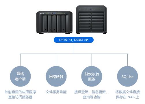 根據(jù)網(wǎng)格化管理的業(yè)務(wù)需求,群暉制定了基于 NAS 文件服務(wù) + Node.js 數(shù)據(jù)庫服務(wù)( sqlite+socket )+ 綠色客戶端軟件的方案,從一開始僅啟用了基礎(chǔ)的文件共享功能,再到資源整合與程序開發(fā),整體架構(gòu)實(shí)現(xiàn)快速部署,能夠滿足鹿城區(qū)行政執(zhí)法業(yè)務(wù)需求。