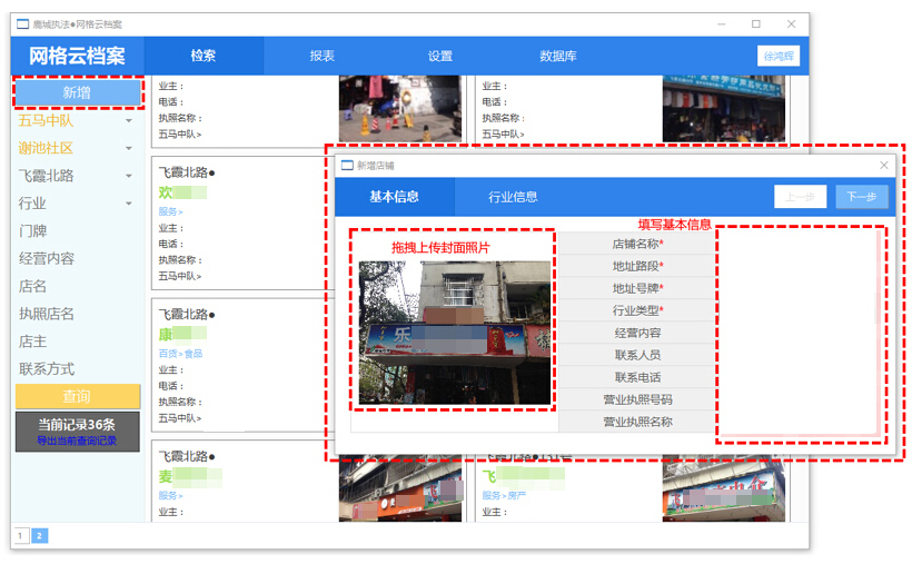 2、上傳信息:執(zhí)法人員通過系統(tǒng)可新增事件,可添加圖片以及填寫基本信息,例如店鋪名、地段、地址。?